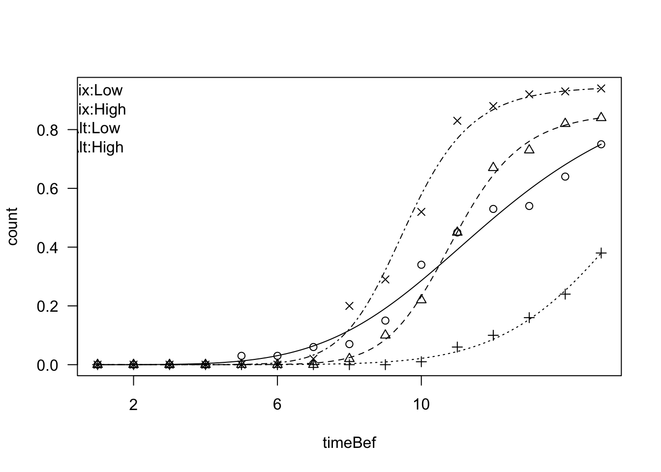 The snippet above shows the first dish. Roughly speaking, we have gone from a WIDE format to a LONG format. The column ‘timeAf’ contains the time when the inspection was made and the column ‘count’ contains the number of germinated seeds (e.g. 9 seeds were counted at day 9). These seeds did not germinate exactly at day 9; they germinated within the interval between two inspections, that is between day 8 and day 9. The beginning of the interval is given in the variable ‘timeBef’. Apart from these columns, we have additional columns, which we are not going to use for our analyses. The cumulative counts of germinated seeds are in the column ‘nCum’; these cumulative counts have been converted into cumulative proportions by dividing by 25 (i.e., the total number of seeds in a dish; see the column ‘propCum’).