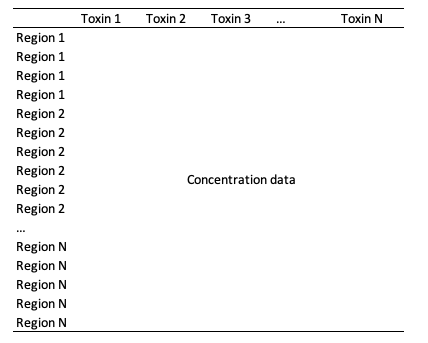 A few days ago, I met a colleague from the plant pathology group, who asked my co-operation for an experiment where he studied the content in 62 mycotoxins in wheat caryopses, as recorded in 70 samples coming from different Italian regions. The dataset was structured as 70 x 64 table, as shown in the scheme below: there is one row for each wheat sample, while the first column represents the sample id, the second column represents the region from where that sample was collected and the other columns represent the concentrations of the 62 toxins (one column per toxin).