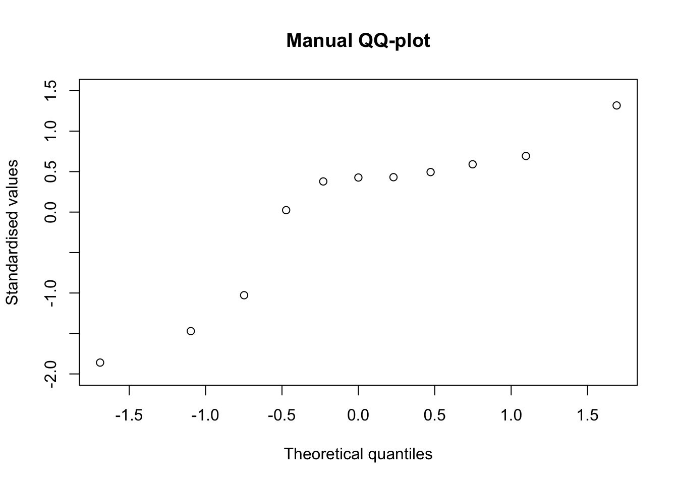 xlab = "Theoretical quantiles", ylab = "Standardised values",