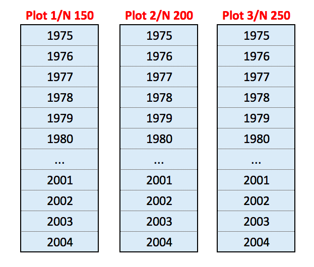 Wheat is grown in continuous cropping from 1983 to 2012, with three fertilisation levels (150, 200 and 250 kg N ha\(^{-1}\)), randomly assigned to three plots in each of three blocks. In all, there are nine plots with yearly sampling, with a total of 270 wheat yield observations in 30 years. The following figure shows the design for one block: the spatial split for each plot represents the actual temporal split.