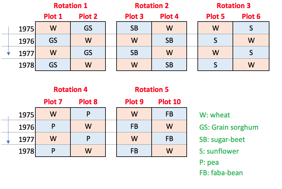 In many instances, the aim of LTEs is to compare different cropping systems, which are allocated to different plots, possibly in different blocks. When the different cropping systems involve rotations, we need to consider a very important rule, that was pointed out by W.G. Cochran in a seminal paper dating back to 1937: “The most important rule about rotation experiments is that each crop in the rotation must be grown every year”. If we do not follow this rule, “the experiment has to last longer to obtain equal information on the long-term effects of the treatments” and “the effects of the treatments on the separate crops are obtained under different seasonal conditions, so that a compact summary of the results of the experiment as a whole is made exceedingly difficult”.