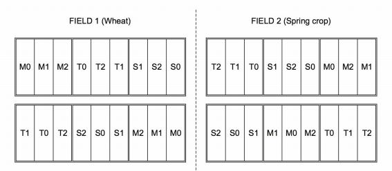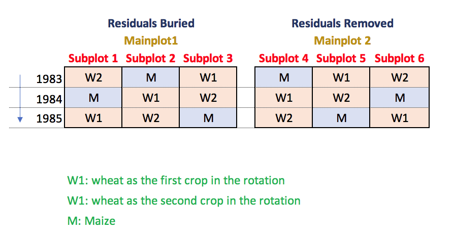Wheat is grown in a three-year rotation maize-wheat-wheat, under two types of management of crop residues (burial and removal), which are randomised to main plots, while the three possible rotation sequences are randomised to subplots. This experiment has 18 plots (three sequences x two treatment levels x three blocks) and, in every year, 12 of those are cropped with wheat and six with maize.