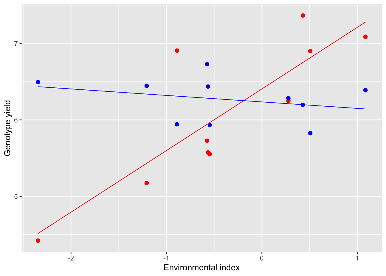 A graphical example may be useful; in the figure below we have two genotypes tested in 10 environments. The yield of the first genotype (red) increases as the environmental index increases, with slope \(\beta_1 = 0.81\). On the other hand, the yield of the second genotype (blue) does not change much with the environment (\(\beta_2 = -0.08)\). Clearly, a high value of \(\beta\) demonstrates that the genotype is responsive to the environment and makes profit of favorable conditions. Otherwise, a low \(\beta\) value (close to 0) demonstrates that the genotype is not responsive and tends to give more or less the same yield in all environments (static stability; Wood, 1976).