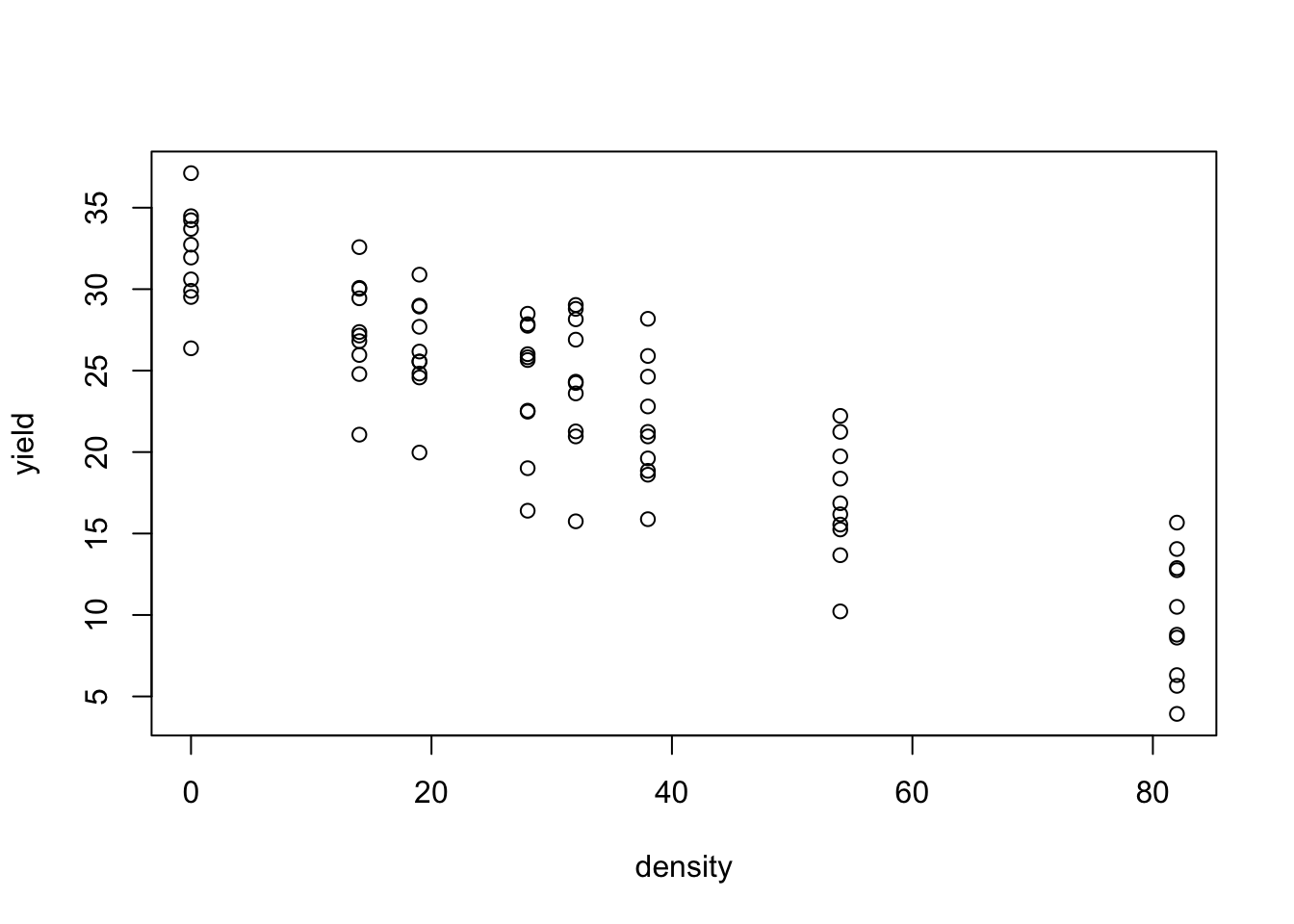 plot(yield ~ density, data = dataset)