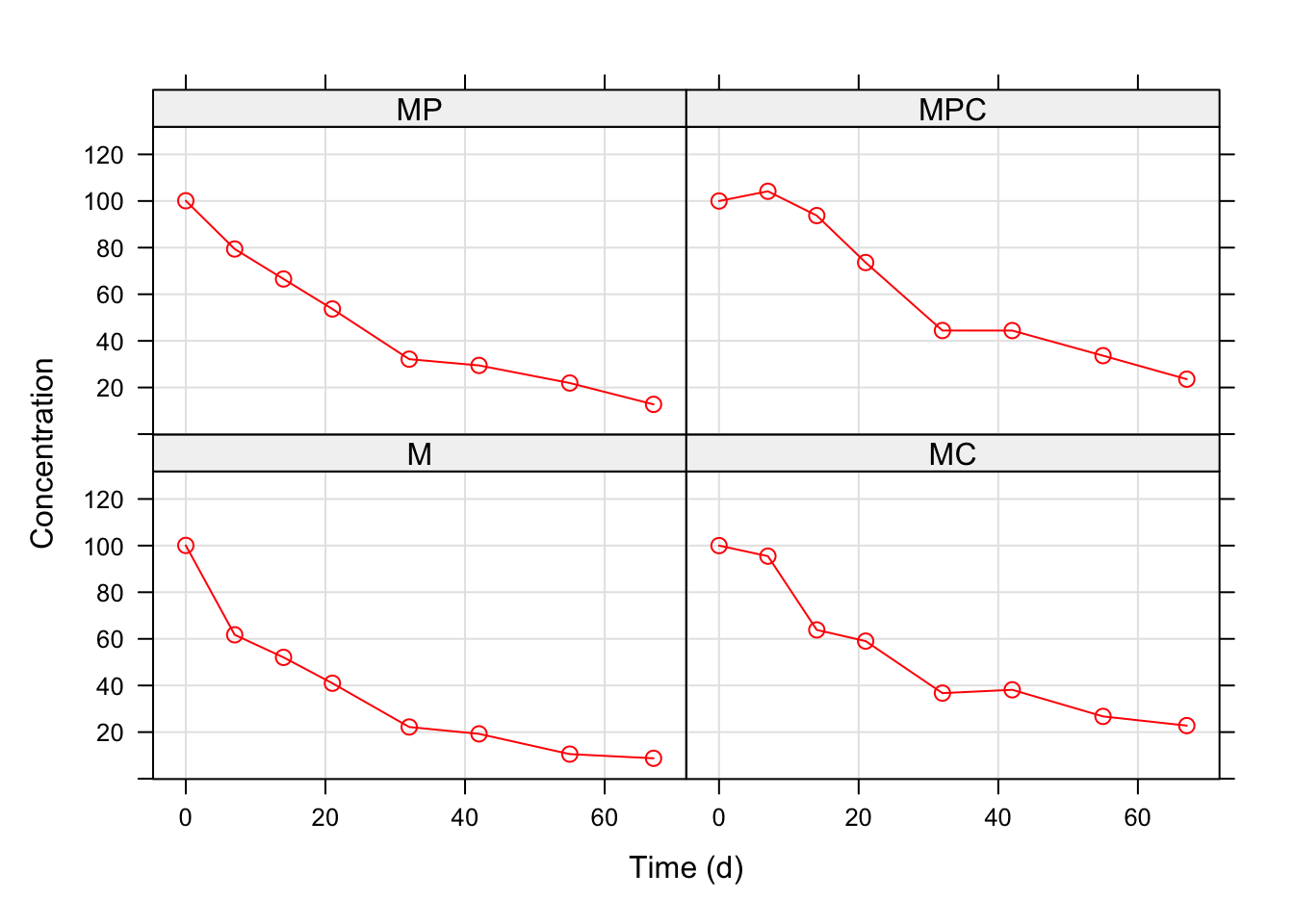 This is a real-life example, taken from a research published by Vischetti et al. in 1996. That research considered three herbicides for weed control in sugar beet, i.e. metamitron (M), phenmedipham (P) and cloridazon (C). Four soil samples were contaminated, respectively with: (i) M alone, (ii) M + P (iii) M + C and (iv) M + P + C. The aim was to assess whether the degradation speed of metamitron in soil depended on the presence of co-applied herbicides. To reach this aim, the soil samples were incubated at 20°C and sub-samples were taken in different times after the beginning of the experiment. The concentration of metamitron in those sub-samples was measured by HPLC analyses, performed in triplicate. The resulting dataset is available within the ‘aomisc’ package; we can load it and use the ‘lattice’ package to visualise the observed means over time.