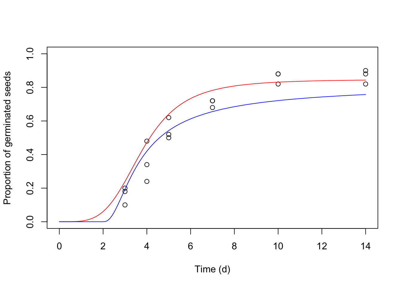 Elsewhere in this website, I show that Equation 1 can be fitted to germination data in a two-steps fashion. In this page we will see how we can embed Equation 1 into a time-to-event model, to predict the proportion of germinated seeds, depending on time and water content in the substrate. As usual, let’s start from a practical example.