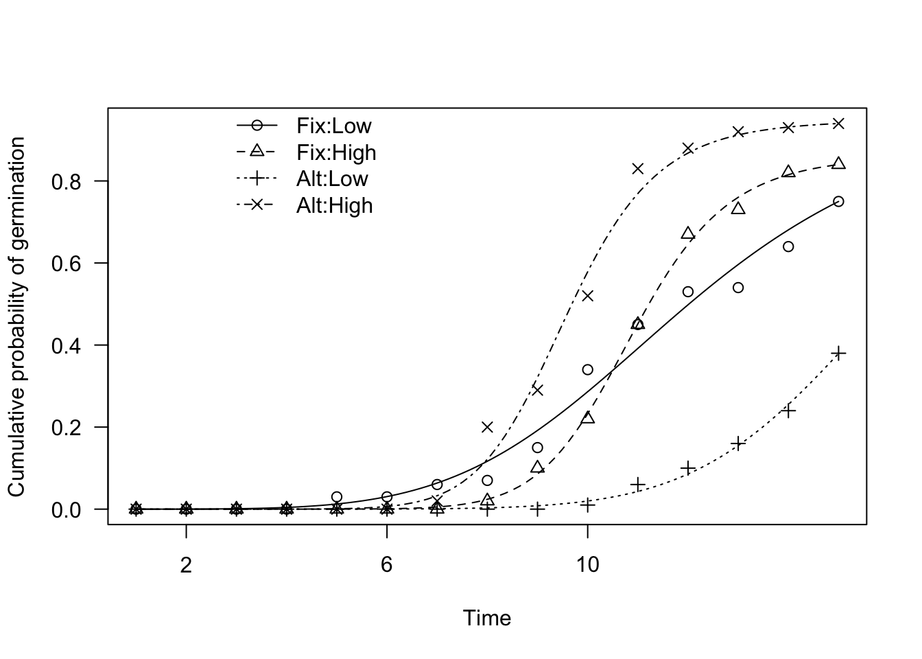 In order to answer this latter question, we should consider the entire time-course of germination and not only one single summary statistic. In other words, we need a method to fit and compare several time-to-event curves.