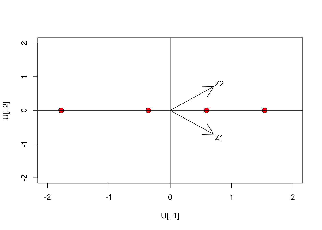 The arrows represent the row-vectors of the rotation matrix: they are the directions of the original axes on the rotated space. We clearly see that the second dimension is totally unnecessary, as we already have a perfect ordination in one dimension. We have performed a rank reduction in our dataset.