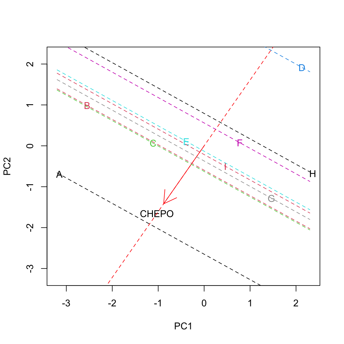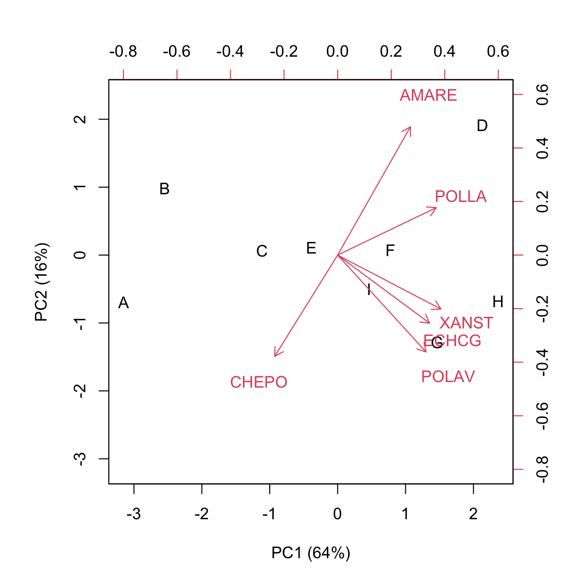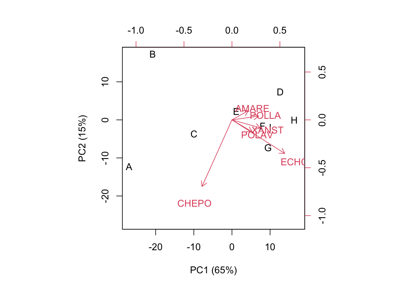 We can see that the herbicides ‘C’, ‘E’, ‘F’ and ‘I’ form a relatively homogeneous group, with a close-to-zero score on PC1 and different scores on PC2. A second group contains the herbicides ‘A’ and ‘B’, with negative values on PC1 and different scores on PC2. A third group contains the herbicides ‘G’ and ‘H’, with positive scores on PC1 and negative scores on PC2. The herbicide ‘D’ seems to be rather peculiar, with positive scores on both PCs.