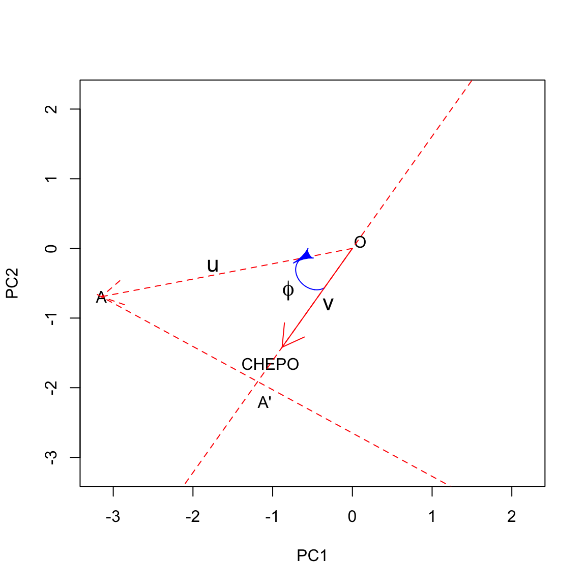 Let’s look at this on a graph, relating to the herbicide ‘A’ and CHEPO. Let’s draw a line along the direction of the vector \(v\): we can identify a positive direction and a negative direction. We can also see that the projection of \(u\) into the direction spanned by the trait-vector \(v\) creates the segment \(OA'\), which has length equal to \(cos \, \phi \cdot \left|u\right|\) (this is one of the trigonometric ratios in right triangles). Let’s call \(l\) this length; now we have: \(z_{ij} = l \times \left| v \right|\). We see that the standardised ground covering of one weed is high where the respective trait vector is long and the projection of the subject vector is long in the positive direction. In this case, the projection is long on the positive side, which means that the herbicide ‘A’ was characterised by high ground covering on CHEPO.