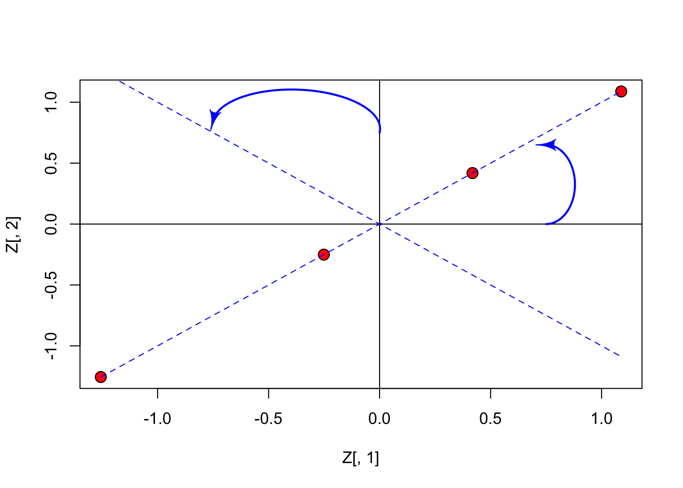 Rotating the axes is a matrix multiplication problem: we have to take the \(Z\) and multiply it by a rotation matrix, to get the co-ordinates of subjects in the new reference system. We do not need the details: if we want to rotate by an angle \(\alpha\), the rotation matrix is: