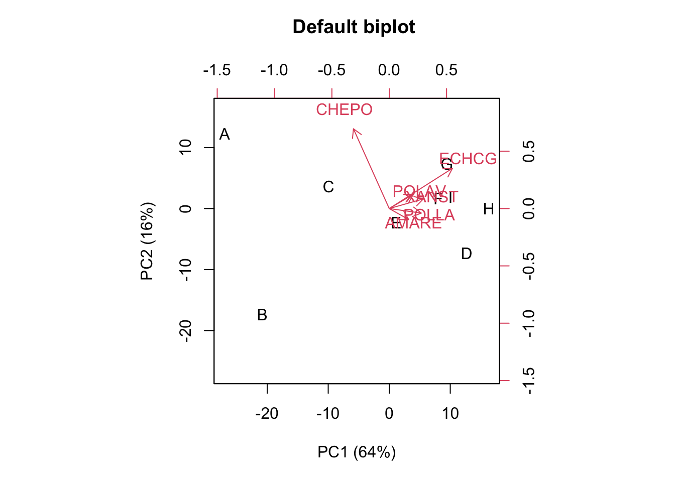 ylab="PC2 (16%)", main = "Default biplot \n\n")