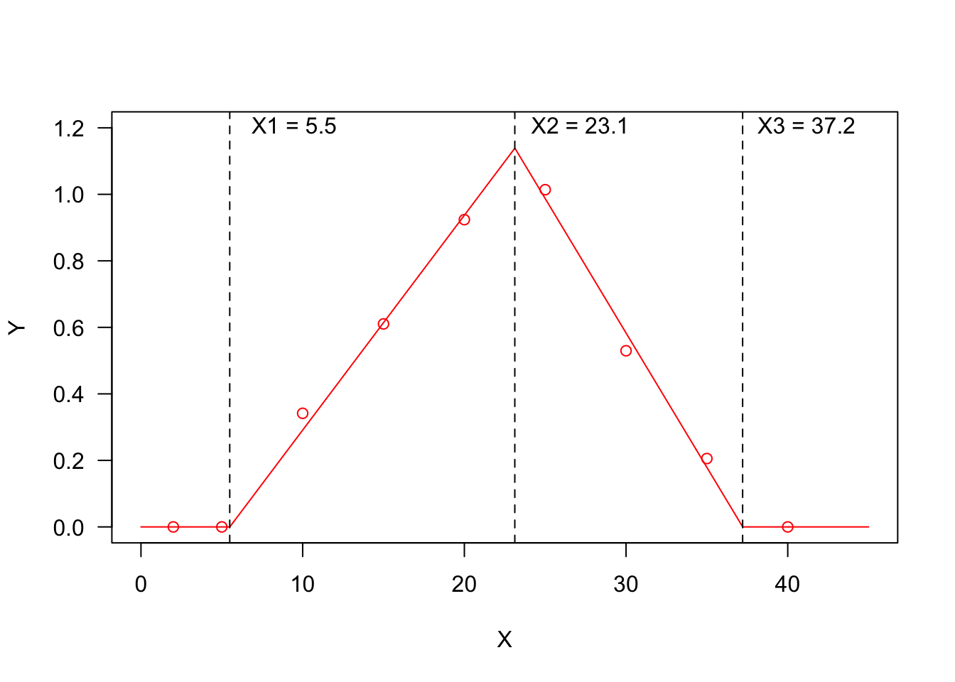 - \(X2 = 23.1\): at this threshold, the response changes abruptly from linearly increasing to linearly decreasing;