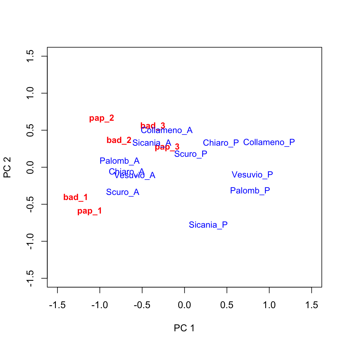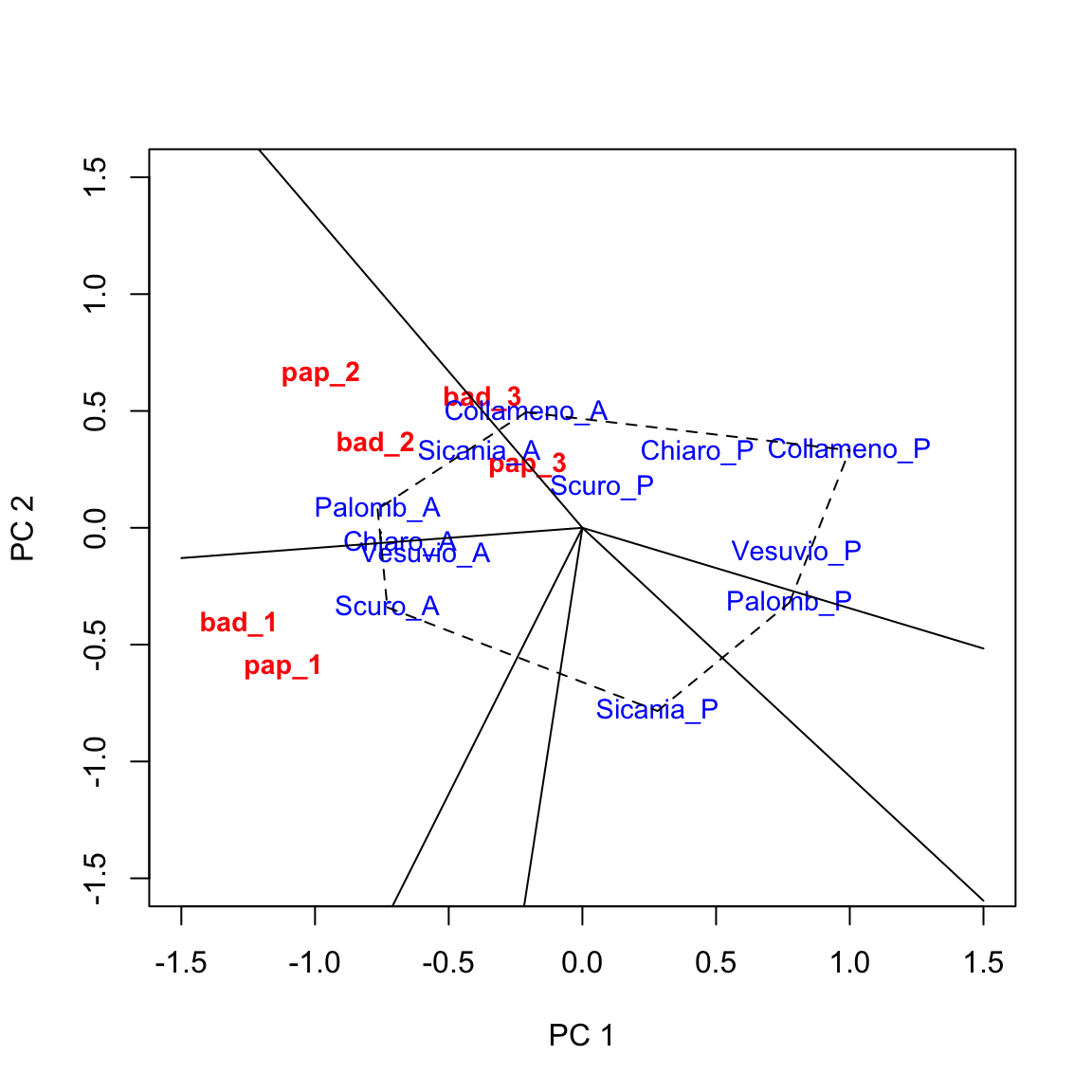 - The perpendicular lines divide the biplot into sectors, and the winning genotype for each sector is the one located on the respective vertex. In this example, ‘Palomb_A’ is the winning genotype in ‘bad_2’, ‘pap_2’ and ‘pap_3’, while ‘Collameno_A, is the winner in ’bad_3’. ‘Scuro_A’ is the winner in ‘bad_1’ and ‘pap_1’.