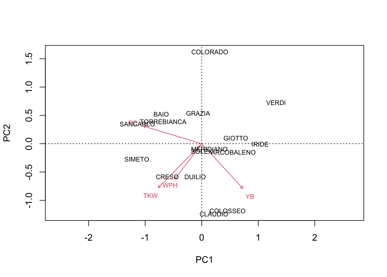 We can see that COLORADO, BAIO and SANCARLO are mainly discriminated by high protein content (PC) and low number of yellow berries (YB). On the other hand, CLAUDIO and COLOSSEO are discriminated by their low PC and high number of YB.