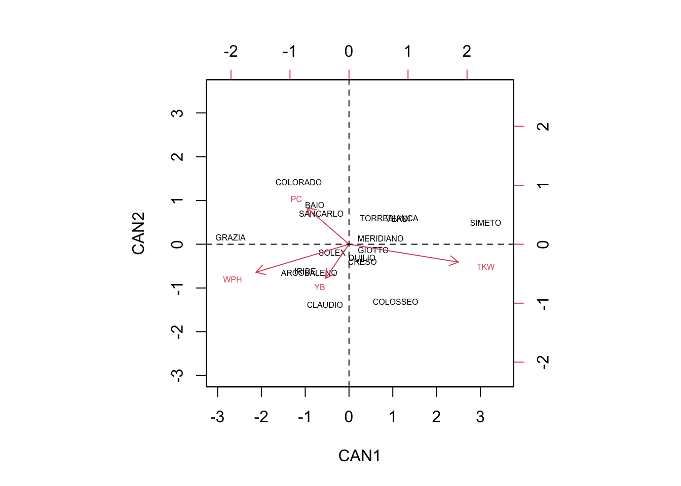 We see that, in contrast to the PCA biplot, the four replicates of each variable are ‘kept’ relatively close together, so that the groups are well discriminated. For example, we see that the genotype COLORADO is mainly found on the second quadrant and it is pretty well discriminated by the genotype ARCOBALENO, which is mainly found on the third quadrant.