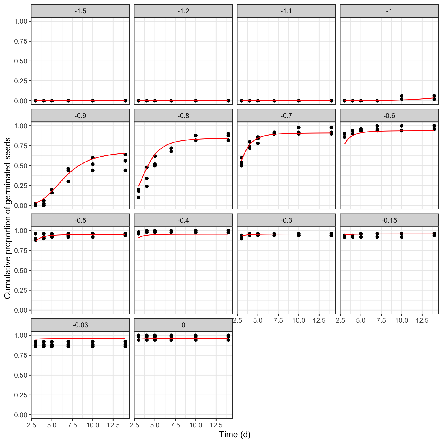 The germination time-course is strongly affected by the water potential in the substrate, as this determines the ability of seeds to absorb water and, consequently, trigger the germination and emergence processes. Therefore, our obvious interest is to understand how the environmental factor affects the time-course of germination.