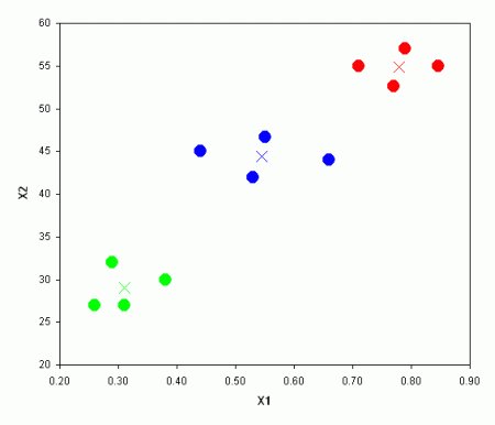 In molti problemi sperimentali agronomici e biologici, tuttavia, le osservazioni sperimentali non sono indipendenti l’una dall’altra, ma sono divisibili in gruppi noti a priori. Guardiamo l’esempio in Figura 1, dove sono individuabili tre gruppi (noti a priori) e i loro ‘centroidi’ (medie di ogni variabile).
