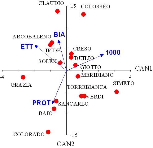 Come esempio di analisi delle variabili canoniche riportiamo una sperimentazione varietale eseguita su grano duro, in più annate consecutive. Questo esempio costituisce una buona base di partenza per altri tipi di applicazioni.